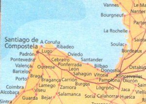 De kaart van de pelgrimsroute Santiago de Compostela.